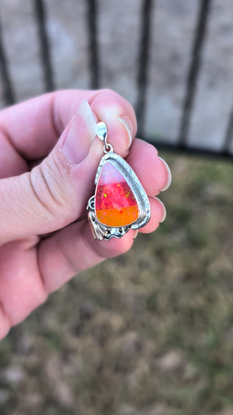 This is a pendant is made by me, Talley. The focal stone is a man-made glitter opal acrylic candy corn. I added a bronze Ghost among the sterling silver setting. All the jewelry in our shop is made by me and my mom; we build our pieces to last a lifetime. Made entirely out of sterling silver, which has been oxidized and polished to show off the detail. Comes with a sterling silver chain-- 16", 18" or 20".