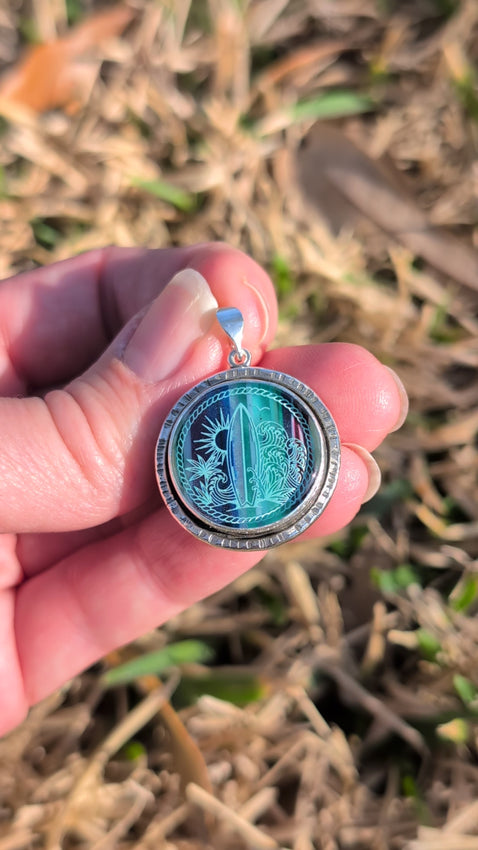 This is a pendant is made by me, Talley! The main stone is a beautiful surfite, which is made from finely layered surfboard paint taken from surfboard factories. Over the Surfite is an engraved and painted piece of acrylic. I added a frame to the edge of the sterling silver setting. All the jewelry in our shop is made by me and my mom; we build our pieces to last a lifetime. Made entirely out of sterling silver, which has been oxidized and polished to show off the detail. Comes with a sterling silver chain-- 16", 18" or 20".
