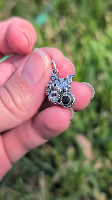 This is little charm is made by me, Talley. The focal stone is a beautiful spinel gemstone. I added a flower among the sterling silver setting. All the jewelry in our shop is made by me and my mom; we build our pieces to last a lifetime. Made entirely out of sterling silver, which has been oxidized and polished to show off the detail. Comes with a sterling silver chain-- 16", 18" or 20".