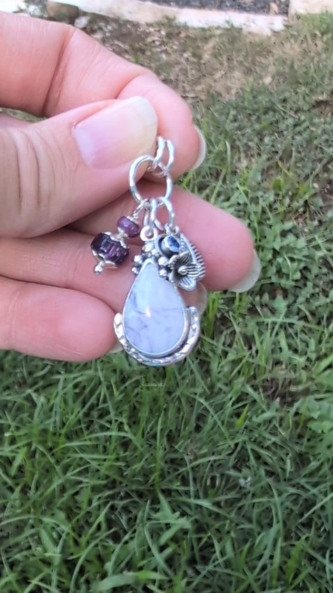 This is a charm pendant was made by me, Talley. It is a collection of charms that hang together on a larger rings and this hangs from a chain. The main stone is a beautiful Tiffany jasper. To accent the stone, I added a tanzanite gemstone on another ring and a ruby and amethyst as a third charm. All the jewelry in our shop is made by me and my mom; we build our pieces to last a lifetime. Made entirely out of sterling silver, which has been oxidized and polished to show off the detail. Comes with a sterling silver chain-- 16", 18" or 20".